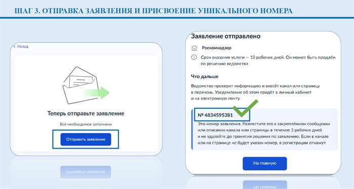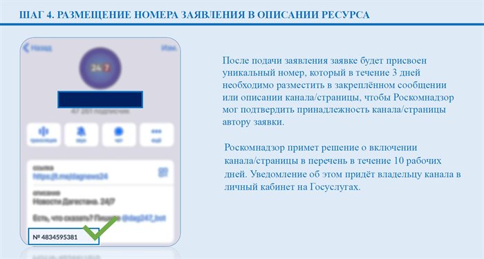 - Заявке будет присвоен уникальный номер, который в течение 3-х дней нужно разместить в закреплённом сообщении или описании канала/страницы, чтобы Роскомнадзор мог подтвердить принадлежность канала/страницы автору заявки.