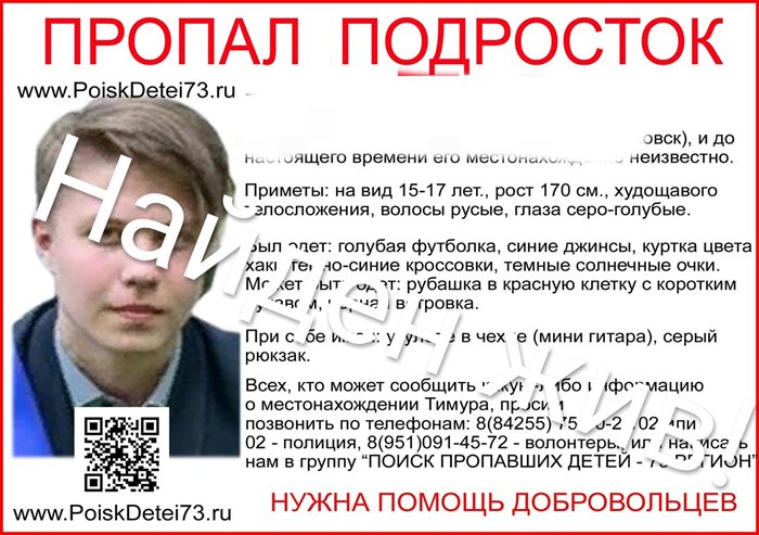 - Мужчина сразу же позвонил нам, волонтерам, и родителям Тимура, - рассказала ulpravda.ru руководитель сообщества «Поиск пропавших детей – Ульяновская область» Зоя Либенсон. – Вчера ночью парень уже был доставлен домой.