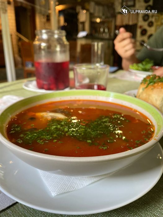В Волгограде, впрочем как и во многих других российских городах, можно попробовать блюда татарской, казахской, кавказской, калмыцкой и даже немецкой кухни. А мы выбрали русские блюда. Официант принес компот в закатанной банке, при нас открыл ее и разлил содержимое по бокалам. Следом подали солянку и котлеты с картошкой.