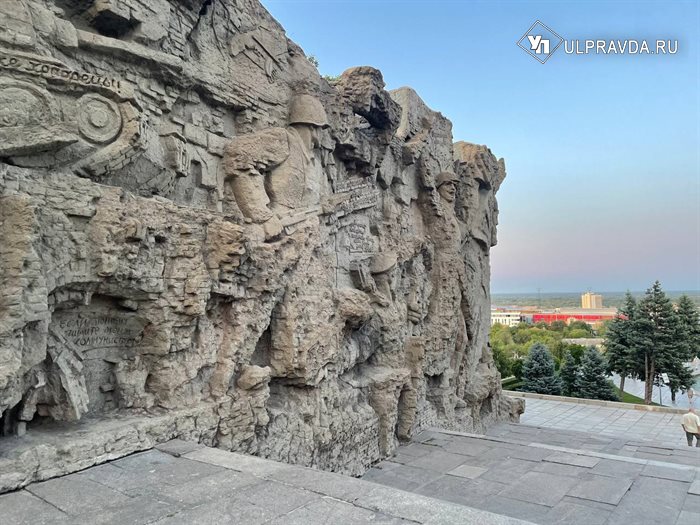 Вдоль подъема к монументу расположены композиции «Стены-руины». На них высечены каменные картины напряженных боев.