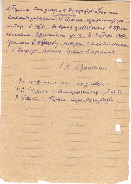 Л.С. Выготский принимал непосредственное участие в судьбе учениц К. Левина в Советском Союзе и был озабочен их трудоустройством. Он устроил Г.В. Биренбаум и Б.В. Зейгарник в Московский институт по изучению высшей нервной деятельности при Комакадемии. Позднее, после реорганизации этого института и переподчинения его Всесоюзному институту экспериментальной медицины, подруги работали в психиатрической клинике ВИЭМ под руководством академика Василия Алексеевича Гиляровского (1876–1959). В апреле 1935 года Гита Васильевна защитила диссертацию на степень кандидата биологических наук.