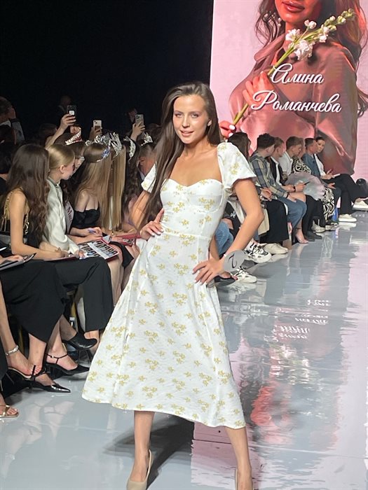 В этот вечер девушки выходили на подиум три раза. Первый выход – визитка, следом тематический, и, наконец, завершающий выход в вечерних платьях.