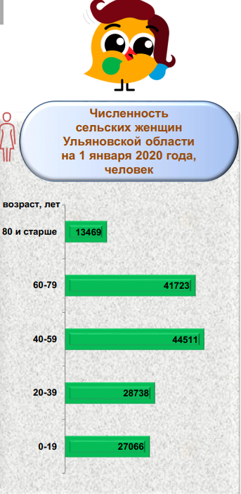 Как посчитали специалисты «Ульяновскстата», в Ульяновской области (по данным на 1 января 2020 года) проживали 143 тысячи 384 сельские женщины. Больше всего среди них представительниц возрастной группы 40 - 59 лет (44511 женщин) и представительниц возрастной группы 60 - 69 лет (41723 женщины).