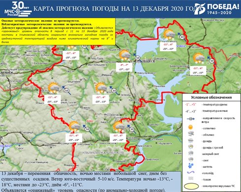 По данным специалистов Ульяновского центра по гидрометеорологии и мониторингу окружающей среды, 13 декабря на территории нашего региона прогнозируется переменная облачность. Днем ожидается погода без существенных осадков. Ветер будет дуть юго-восточный, со скоростью 5-10 метров в секунду. Температура воздуха днём от - 6° до - 11° С.