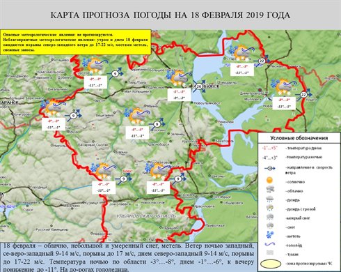 По данным специалистов Ульяновского центра по гидрометеорологии и мониторингу окружающей среды, 18 февраля на территории нашего региона будет облачная погода. Ожидаются небольшой, умеренный снег, метель. Днем ветер будет северо-западный, дуть он будет со скоростью 9 - 14 метров в секунду, при порывах - 17 - 22 метров в секунду. Температура воздуха днем по области -1°…-6°, к вечеру понижение до -11°. На дорогах - гололедица.
