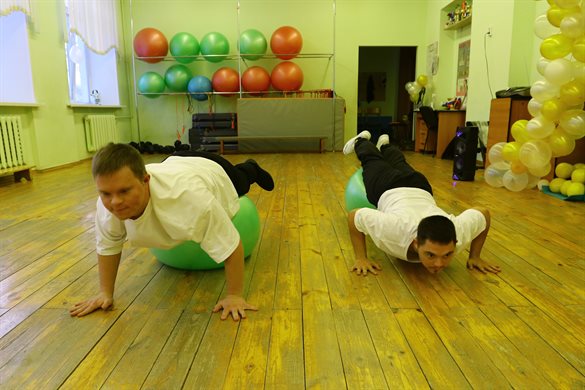 Прямо скажу, упражнение не из легких - отжаться и не потерять равновесие сможет далеко не каждый. Но Алексей Сапегин и Иван Трухачев справляются с ним влегкую, профессионально. На вопрос, нравится ли им заниматься физкультурой, отвечают единогласно: да!