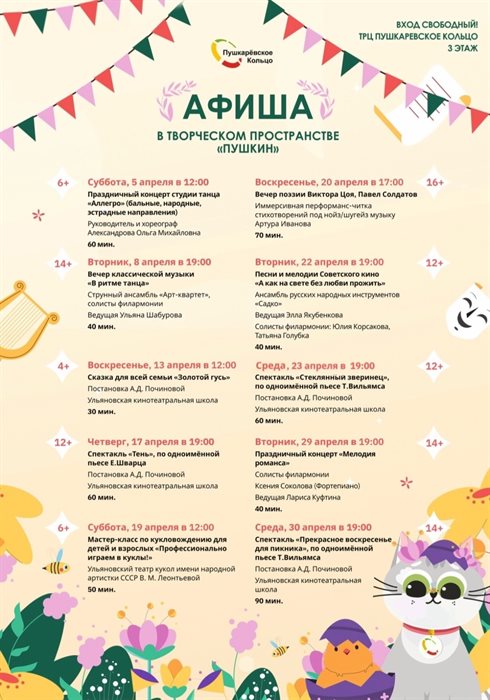 Сказку для всей семьи «Золотой гусь» представит в творческом пространстве «Пушкин» Ульяновская кинотеатральная школа (0+). А расписание на апрель в «Пушкине» смотрите на афише.