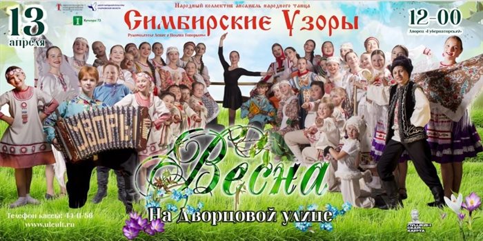 В воскресенье в 12:00 на сцене Дворца «Губернаторский» состоится концерт народного коллектива ансамбля танца «Симбирские узоры» (руководители - лауреаты областной премии «Браво, Маэстро!» Денис и Полина Топорковы). В концертной программе «Весна на Дворцовой улице» можно будет увидеть танцевальные номера, в которых примут участие все группы ансамбля. Впервые выйдут на сцену самые маленькие участники ансамбля. (6+).
