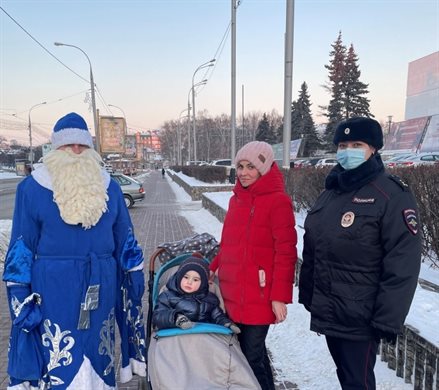 Полицейский Дед Мороз и автоинспекторы рассказывают участникам дорожного движения о том, что в сумерках или в темноте пешехода на проезжей части почти не видно. Благодаря световозвращающим элементам водитель может заблаговременно увидеть пешехода на дороге. Инспекторы ГИБДД напоминают детям и их родителям основные правила дорожного движения и объяснили значения некоторых дорожных знаков.