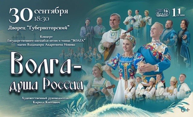 30 сентября открывает творческий сезон Государственный ансамбль песни и танца «Волга» и приглашает на грандиозный концерт-презентацию новой программы «Волга — душа России» во ДДН «Губернаторский». Это будет праздник души и танца! (6+)