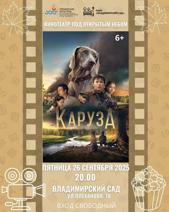 Парк «Владимирский сад» завершает сезон кинопоказов под открытым небом. Заключительный сеанс — семейный фильм «Каруза». Это история мальчика и его пса по кличке Каруза, чья преданность помогла выжить в суровые дни блокады Ленинграда. Фильм основан на реальных событиях. Вход свободный. (6+)