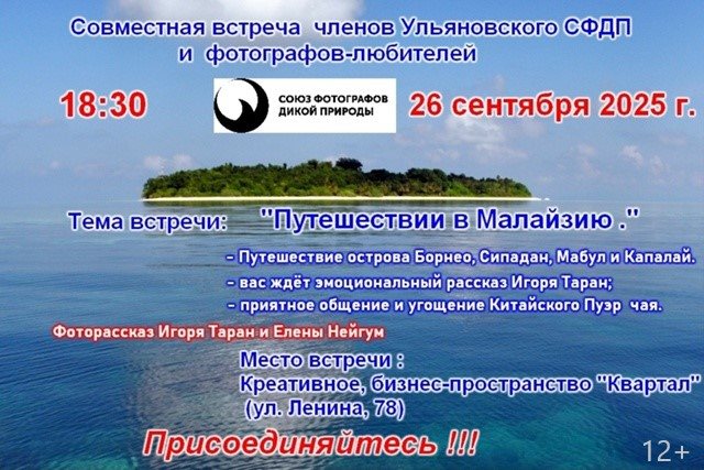 Сегодня в 18:30 в креативном пространстве «Квартал» ульяновский союз фотографов дикой природы и фотографы-любители организуют встречу с путешественником Игорем Тараном, который расскажет о своем открытии Малайзии, об островах Борнео, Сипадан, Мабул и Капалай, представит живописные фото Елены Нейгум и угостит всех участников встречи настоящим китайским чаем. (12+)