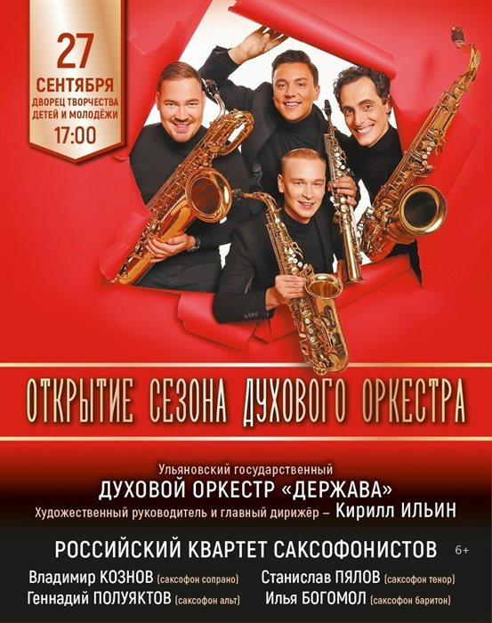 В субботу Ульяновский государственный духовой оркестр «Держава» во главе с художественным руководителем и главным дирижёром Кириллом Ильиным откроет свой концертный сезон с Российским квартетом саксофонистов, победителем I Международного конкурса ансамблей «Национальная коллекция». Вниманию зрителей представляются редкий состав инструментов, захватывающая красота звучания и высочайший профессионализм музыкантов. Участники ансамбля - финалисты и лауреаты телевизионного проекта «Квартет 4х4» канала «Россия Культура».