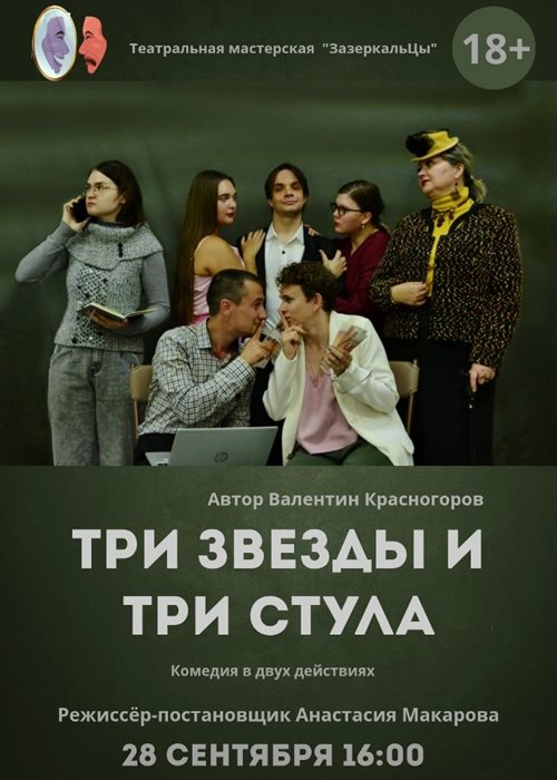 Театральная мастерская «Зазеркальцы» 28 сентября в 16:00 представит на суд зрителей премьеру «Три звезды и три стула» по пьесе Валентина Красногорова. Это первый спектакль на сцене любительского театра. Пожелаем ни пуха ни пера и приготовим ладошки для аплодисментов! (18+)