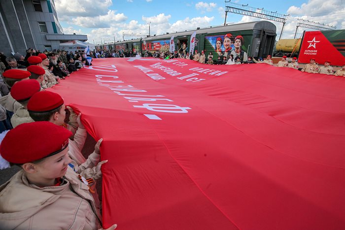 Уникальная агитационно-пропагандистская акция «Единство в памяти. Сила в подвиге!» проводится совместно с «Российскими железными дорогами» с 19 апреля по 3 июля. За эти 75 дней поезд преодолеет более 33 тысяч километров, посетит 75 городов и населенных пунктов в 61 субъекте страны. Цель акции – сохранение исторической памяти, выражение благодарности ветеранам и уважения ратного подвига современных героев – участников Специальной военной операции.