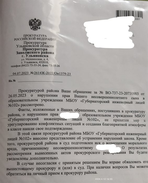 По жалобам ульяновской родительницы прокурором были инициированы иски в Заволжский районный суд Ульяновска, где состоялись два процесса. В 2023 году суд рассматривал два иска прокурора, поданные в интересах ребёнка Ольги по фактам необеспечения образовательным учреждением безопасности ученика. В итоге по первому решению суда Губернаторский инженерный лицей № 102 обязали выплатить Ольге, действующей в интересах несовершеннолетнего сына, компенсацию морального вреда в размере 30 000 рублей. Во втором судебном процессе суд взыскал с лицея для ребёнка 50 000 рублей в качестве компенсации морального вреда. Лицей пытался вернуть деньги, выплаченные за издевательства над учеником, но не вышло.