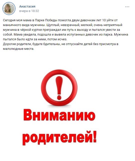 Женщина написала, мол, девочкам лет 10 в парке Победы преграждал путь щуплый, неприятный мужчина. Якобы тот пытался увести с собой школьниц.