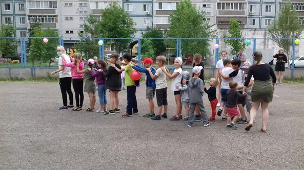 Во дворе дома № 22 по улице Заречной устроили большой праздник - детей угощали бесплатным мороженым, для всех желающих провели концерт, а детскую площадку украсили воздушными шарами.
