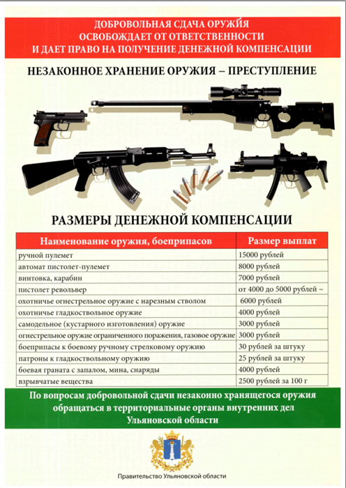 В соответствии с постановлением правительства Ульяновской области жители региона могут получить денежное вознаграждение за добровольно сданное оружие. Как правило, это незарегистрированное оружие, которое гражданин либо нашел, либо получил в наследство, не вступив в право владения им.