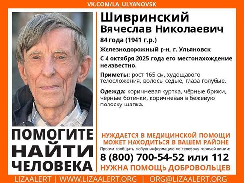С воскресенья, 5 октября, местонахождение Вячеслава Николаевича Шивринского неизвестно. О начале поисков объявил поисковый отряд «ЛизаАлерт».