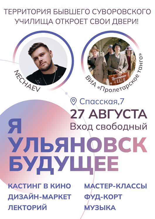 В День российского кино, 27 августа, с 12.00 до 22.00 в Ульяновске на закрытой территории бывшего Суворовского училища на улице Спасской, 7 пройдет большой семейный праздник «Я – Ульяновск – Будущее» (0+). Он объединит самые креативные проекты региона.