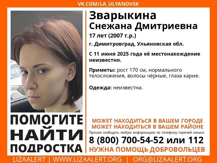 11 июня из дома ушла 17-летняя Снежана Зварыкина. Неизвестно, в какой одежде она была в день пропажи. Сама девушка ростом 170 см, нормального телосложения, с черными волосами и карими глазами.
