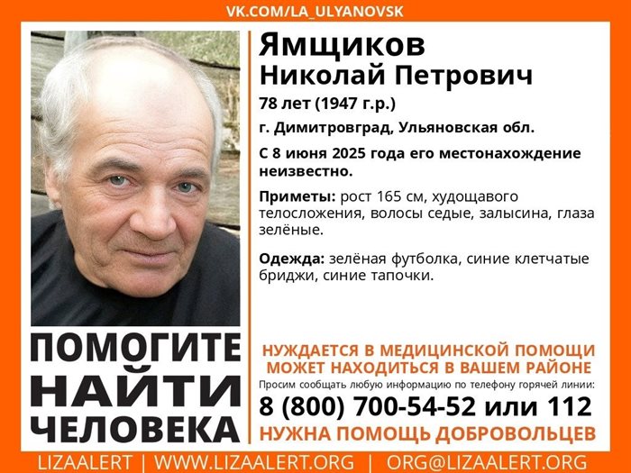 Волонтеры поискового отряда «ЛизаАлерт» сообщили, что в Димитровграде пропал пенсионер Николай Ямщиков.