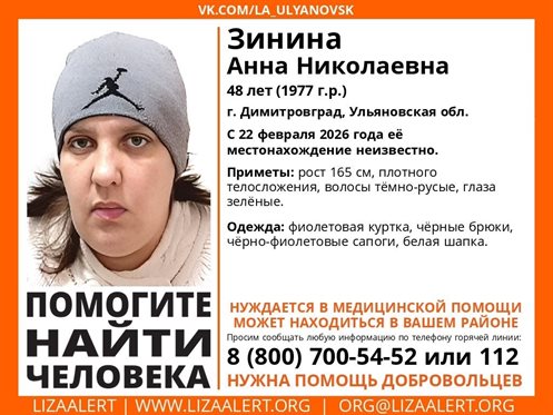Волонтеры поискового отряда «ЛизаАлерт» сообщили, что с 22 февраля в Ульяновской области начались поиски Анны Зининой. 48-летняя женщина ушла из дома и не вернулась.