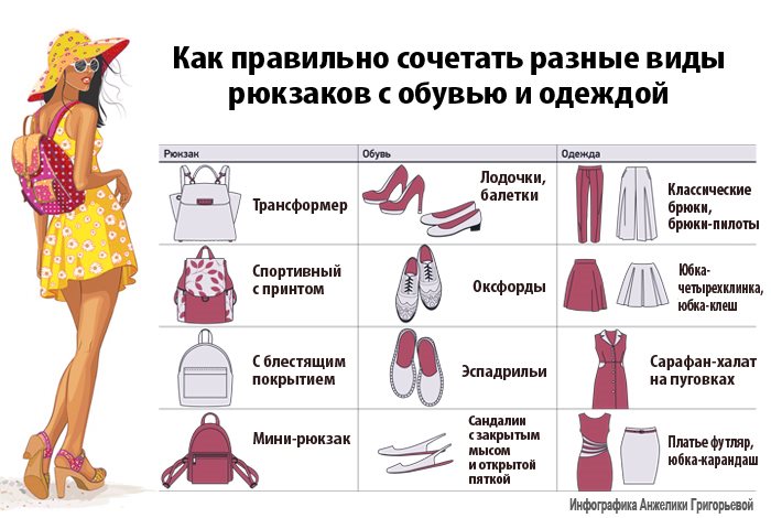 Есть и еще один нюанс. Рюкзаки надо правильно сочетать с обувью и другими элементами гардероба. Разобраться в этом вам поможет наша инфографика: