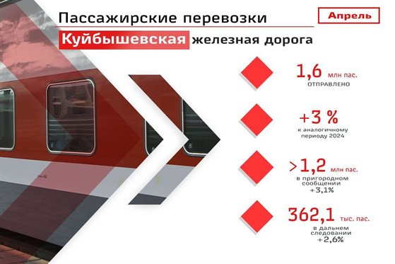 Пассажирооборот на Куйбышевской железной дороге в апреле 2025 года составил 396 миллионов пассажирокилометров, что на 1,4% больше, чем за аналогичный период прошлого года. При этом, в пригородном сообщении пассажирооборот вырос на 6,2%, составив 60 миллионов пассажирокилометров, а в поездах дальнего следования – 336,2 миллиона пассажирокилометров, что выше показателя прошлого года на 0,6%.