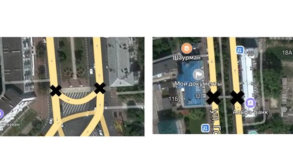 От первого из них до оборудованного светофором перекрёстка с улицей Карла Либкнехта – 150 м, от второго – 86 и 123 м до светофоров на Льва Толстого и Ленина соответственно.