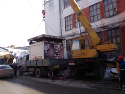Сотрудники МУП «УльГЭС» отсоединили от киосков электрические провода, специнструментом разрезали соединявшие их металлические поперечины, при помощи автокрана погрузили на грузовик и по очереди вывезли.