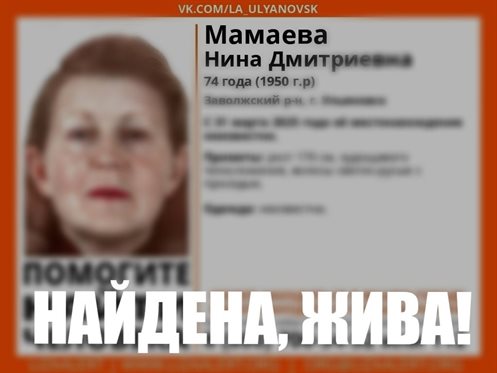 Поисковый отряд «ЛизаАлерт» сообщает, что с 31 марта ведутся поиски Нины Мамаевой.