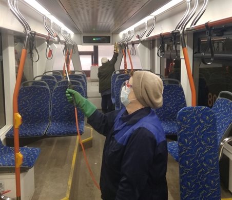 Санитарная обработка осуществляется два раза в день с применением специальных средств. После каждого рейса на разворотных площадках усиленно дезинфицируются поручни и ручки дверей в салоне.