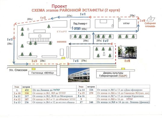 В Засвияжском районе в 10:20 на Олимпийском проспекте будет дан старт 67-й традиционной легкоатлетической эстафете. Построение участников и торжественный парад открытия будет проходить на площади перед Дворцом художественной гимнастики «Татьяна-Арена» (проспект Олимпийский, 7) в 10:00.