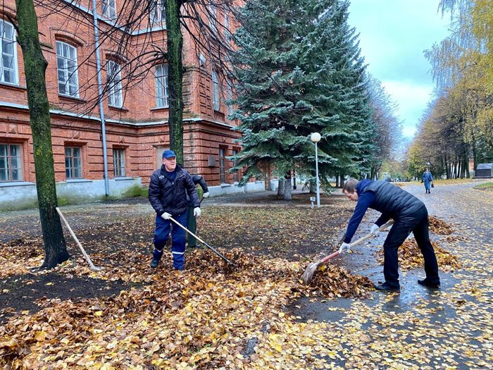 В частности, на уборку территории бывшего Суворовского училища вышли сотрудники администрации города. Они собирают мусор, ветки, с помощью специальной техники вывозят опавшие листья.