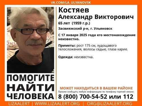 Поисковый отряд «ЛизаАлерт» сообщает, что 17 января в Ульяновске пропал 65-летний мужчина. В июле близкие и родные люди Александра Костяева обратились к волонтерам отряда за помощью.