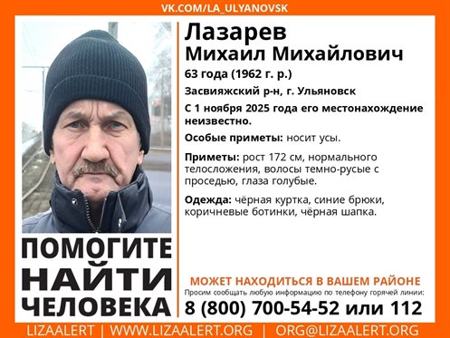 «Михаил Лазарев ушел из дома 1 ноября 2025 года и не вернулся. Сам мужчина ростом 172 см, нормального телосложения с темно-русыми с проседью волосами и голубыми глазами. Ульяновец носит усы, а в день пропажи был в черной куртке, синих брюках, коричневых ботинках и черной шапке. Если вы видели или знаете, где находится мужчина, то сообщите по телефону горячей линии 88007005452 или 112», – сказали волонтеры.