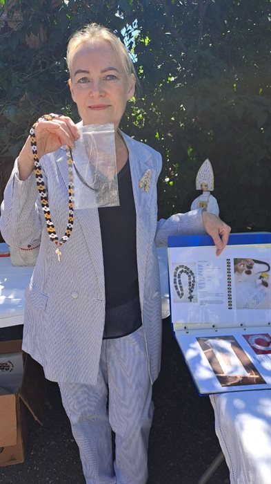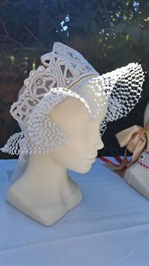 - В Олонецкой губернии была развита добыча речного жемчуга, поэтому абсолютно все девушки, в том числе и крестьянки, ходили именно в таком головном уборе. В нашем варианте поднизь сплетена на леске, потому что мы даем мерить изделия тем, кто приходит к нам на мастер-классы. Но раньше этот головной убор плели на белом конском волосе, которому свойственно немного тянуться, - рассказала Инна Каминская.