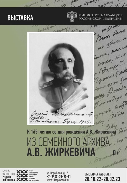 Среди массы верных сынов России имя Александра Жиркевича, 165-я годовщина со дня рождения которого отмечается 29 ноября этого года, стоит на особом месте. Причин тут несколько: Жиркевич, несомненно, был «выдающимся из выдающихся», с другой стороны, как и многие, оказался в жерновах своего времени. Он прожил в Симбирске всего 10 лет, его внучка Наталья Жиркевич-Подлесских передала в дар музею-заповеднику «Родина В. И. Ленина» семейный архив, оставленный дедом. На новой выставке в музее «Симбирская чувашская школа. Квартира И. Я. Яковлева» «Из семейного архива А. В. Жиркевича» многие документы представлены впервые.