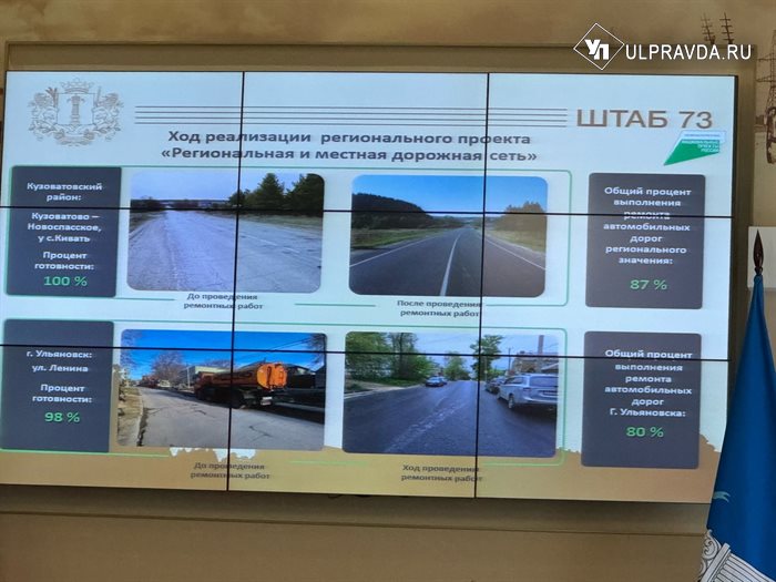 В числе дорог, где завершается ремонт, например, улица Ленина в областном центре, на участке от улицы 12 Сентября до реки Свияги. Здесь ремонт выполнен на 98%. На 100% отремонтировали дороги в Кузоватовском районе.