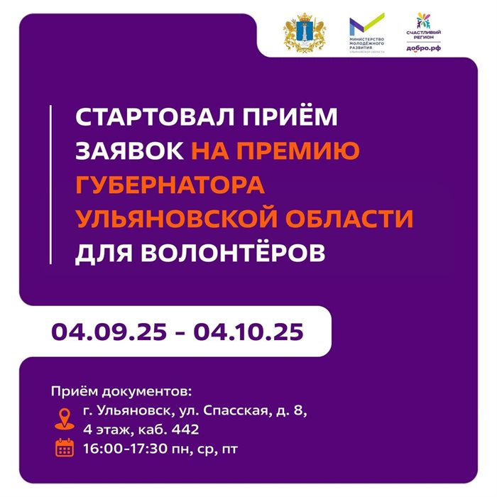 Конкурсные материалы принимают очно в Министерстве молодёжного развития по адресу: г. Ульяновск, ул. Спасская, д. 8, каб.442 (пн, ср, пт 16:00-17:30).