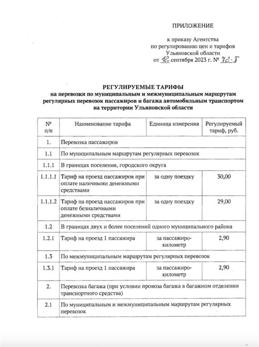 Утверждены новые регулируемые тарифы на перевозки пассажиров по муниципальным и межмуниципальным маршрутам. Согласно документу, тариф на проезд пассажиров в границах городского округа или поселения при оплате наличными будет составлять 30 рублей, по безналичному расчёту – 29 рублей. Кроме того, если речь идёт о перевозках в границах двух и более поселений или по межмуниципальным маршрутам, то цена будет составлять 2,90 рубля за пассажиро-километр.