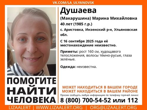 Поисковый отряд «ЛизаАлерт» сообщает, что с 16 сентября ведутся поиски жительницы села Аристовка Инзенского района Марины Душаевой (Макарушиной).