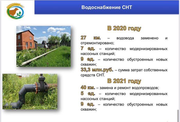 Например, в 2020 году на ремонт дорог, ведущих к садовым товариществам, было направлено 15,1 миллиона рублей. Также проведены работы по ремонту и замене порядка 27 километров водовода, модернизировано семь насосных станций, обустроены девять новых скважин. В феврале 2021 года дан старт образовательному проекту по обучению многодетных семей основам ведения приусадебных участков. В этом году продолжатся работы по энергообеспечению садоводческих товариществ, по строительству и ремонту автомобильных дорог, ведущих к ним. Особое внимание будет уделено образовательным программам для садоводов и популяризации направления.