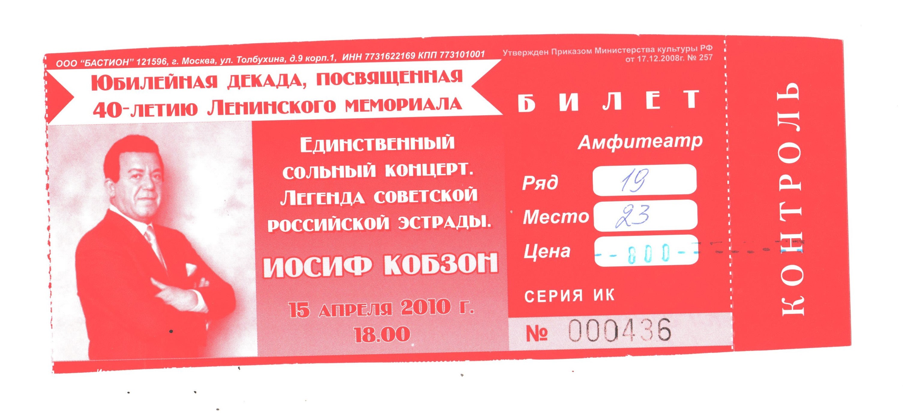 В фондах Мемцентра хранятся билеты с концерта Иосифа Кобзона от 15 апреля 2010 года. Тогда он приезжал на 40-летие Ленинского мемориала.