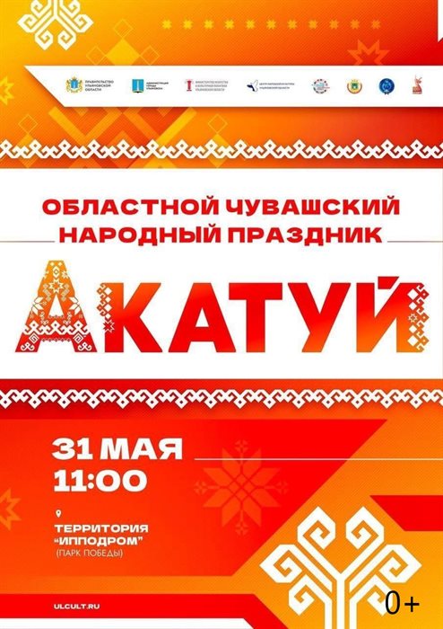 Тоже весело, нарядно и позитивно будет 31 мая в Парке «Победы». Здесь с 11:00 развернется чувашский народный праздник «Акатуй». Гостей ждут выставки национальных ремесел и декоративного прикладного искусства, спортивная национальная борьба «Кĕрешÿ», выставка-конкурс национальных чувашских подворий Ульяновской области, концерт и угощения. (0+).