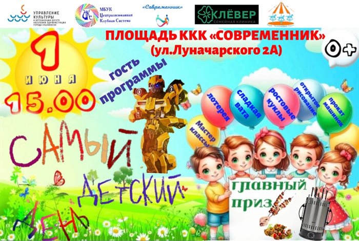 Воскресенье – детский день! В парках Ульяновска, библиотеках и на других площадках подготовлено множество мероприятий, игр, развлечений и прочих активностей. Подробности – на афишах парков и в группе "Парки Ульяновска" (ВК). В Парке имени Василия Маргелова семейный праздник будет проходить по благословению Митрополита Симбирского и Новоспасского. Начало мероприятия в 11:00. В Парке «Победы» с 10:00 до 14:00 малышей будут бесплатно катать на детских аттракционах «Юнга», «Колокольчик», «Солнышко», «Верблюды». В ТЦ «Оптимус» юных посетителей ждут герои мультфильмов Супер-Кот, Леди Баг, гонщик Райдер, шоу мыльных пузырей, аквагрим и сладкая вата. Детский праздник развернется и у ТЦ "Аквамолл". (0+).
