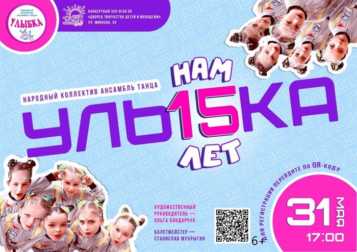 Народный коллектив ансамбль танца «Улыбка» будет отмечать свое пятнадцатилетие 31 мая в 17:00 в концертном зале «Дворца творчества детей и молодежи». Обещают много-много хорошего настроения, шуток и, естественно, улыбок. (6+).