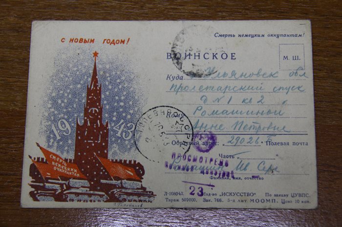 Длинные письма домой на праздники встречались реже, чем короткие поздравления родным на открытках. А иногда даже на праздничных листках. Один из них хранится в Государственном архиве новейшей истории. На страничке изображена боевая сцена, а внизу подписано: «Боевой новогодний привет с фронта всем родным и знакомым!» Фронтовое поздравление родным с новым, 1942 годом отправляет ульяновец Евгений Митрюшкин. К сожалению, это было последнее письмо, которое он написал.